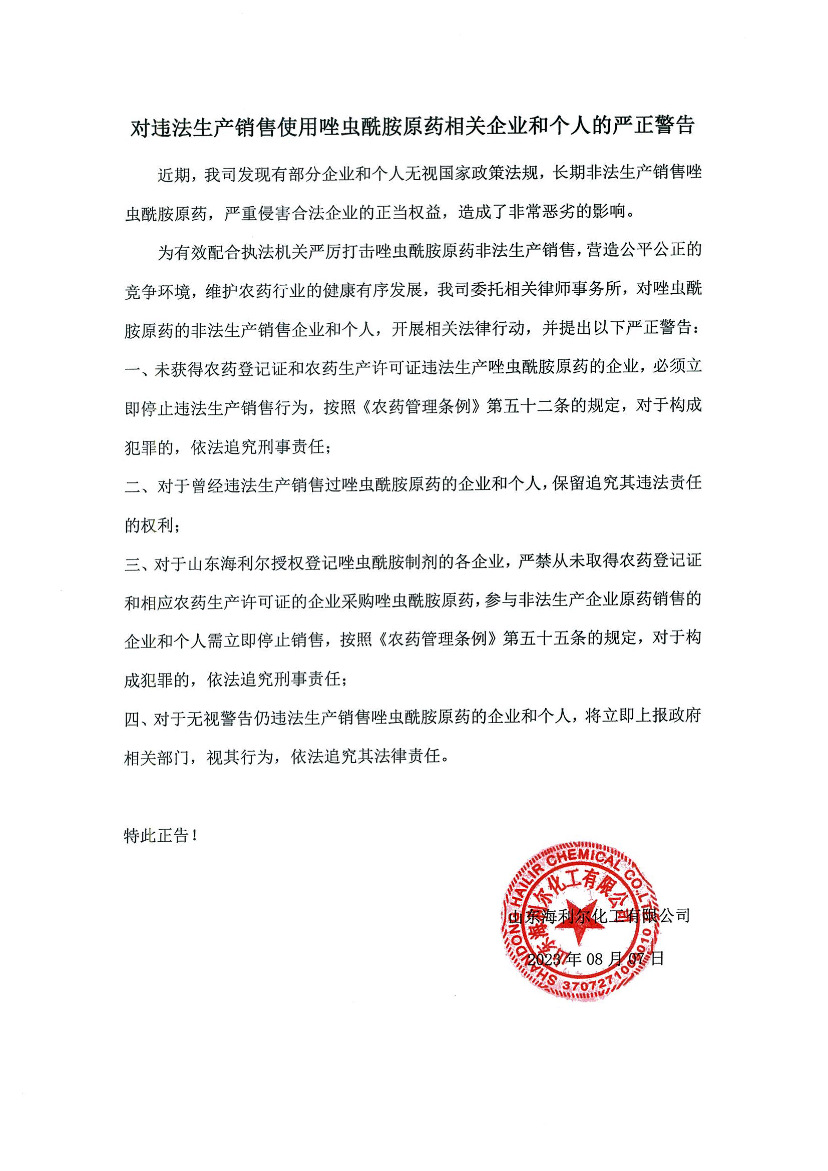 對違法生產(chǎn)銷售使用唑蟲酰胺原藥相關(guān)企業(yè)和個人的嚴正警告