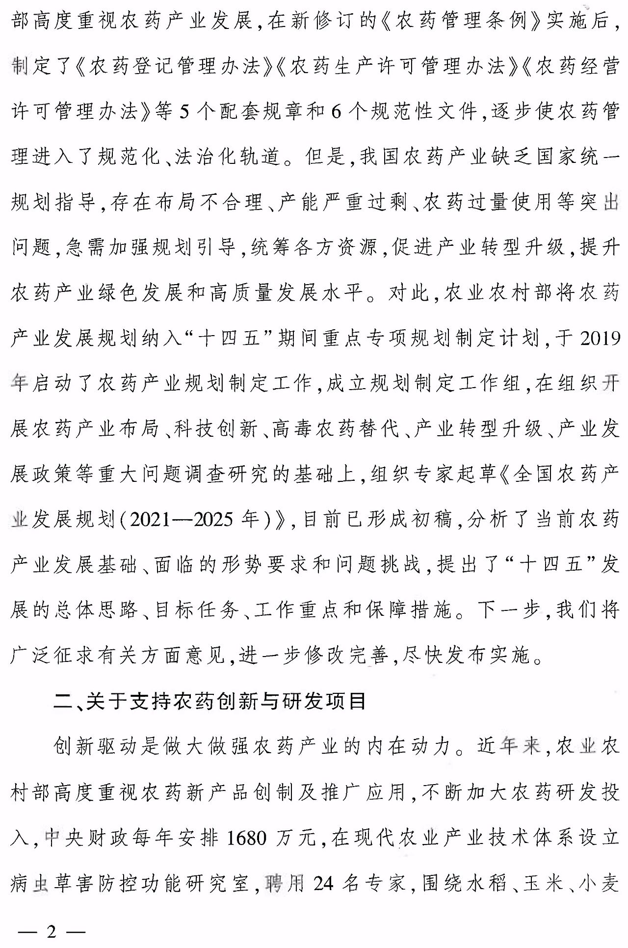 《全國(guó)農(nóng)藥產(chǎn)業(yè)發(fā)展規(guī)劃(2021—2025年)》,目前已形成初稿,分析了當(dāng)前農(nóng)藥產(chǎn)業(yè)發(fā)展基礎(chǔ)、面臨的形勢(shì)要求和問(wèn)題挑戰(zhàn),提出了“十四五”發(fā)展的總體思路、目標(biāo)任務(wù)、工作重點(diǎn)和保障措施。