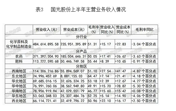 ? ? 近日,中化國際(控股)股份有限公司(股票代碼:600500;以下簡稱“中化國際”)、四川國光農化股份有限公司(股票代碼:002749;以下簡稱“國光股份”)和聯化科技股份有限公司(股票代碼:002250;以下簡稱“聯化科技”)分別發布了2018年半年度報告。其中,國光股份實現上半年營業收入和凈利潤雙增長;聯化科技上半年營收和凈利潤則雙雙同比下降。
