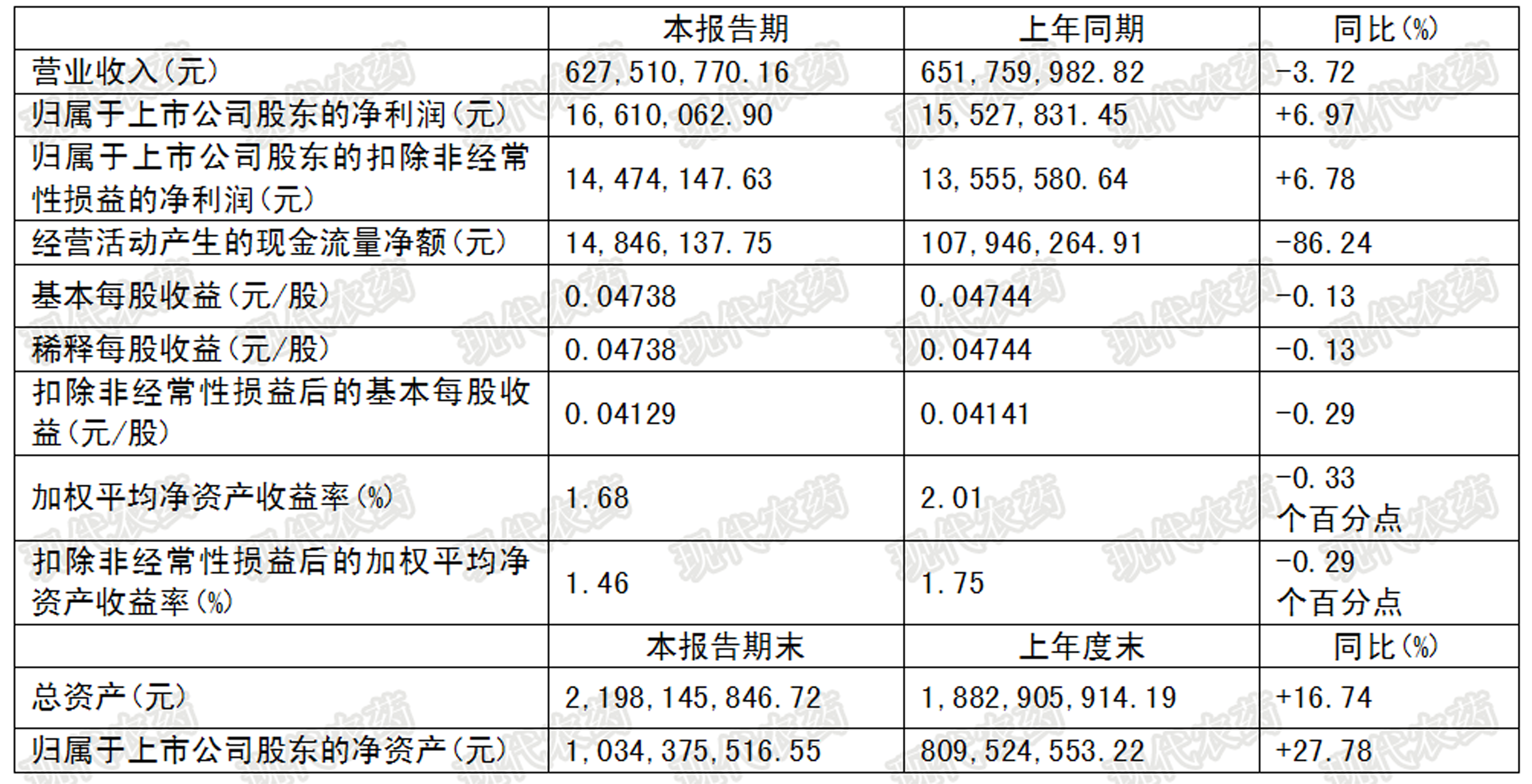 ??? 報告期內,公司實現合并營業收入124,938.51萬元,同比增長50.45%;實現歸屬于上市公司股東的凈利潤24,048.72萬元,同比增長62.44%。在此期間,公司取得高新技術企業證書;同時,公司自籌資金新建煙堿類殺蟲劑項目開工建設。