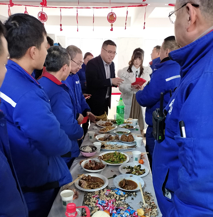 除夕當日,凱源祥房雷華廠長、吳桂言副廠長、張述州處長、仇兆鵬副主任代表公司,向一線員工送出最誠摯的新年祝福。據統計,春節期間凱源祥堅守一線的員工共計140人,他們是海利爾的真英雄。值此佳節,卻一心為公,用責任與擔當墊起海利爾邁步向前的基石,展示著新時代海利爾人開拓拼搏的奮進精神。此時此刻,這個年相聚凱源祥,有人力行政處為堅守一線的家人們精心制作的美味年夜飯,有集團送來的香甜暖心的水果,有加油鼓勁的拔河活動,也有自告奮勇的上臺表演,多的是笑聲與陪伴,這個年我們也因此不孤單。在新的一年,凱源祥人將以礪刀鋒、站住崗、始向前的精神磨煉本領,在董事長總裁的引領下,奮勇拼搏、激流勇進,奏響海利爾高質量發展的時代樂章。