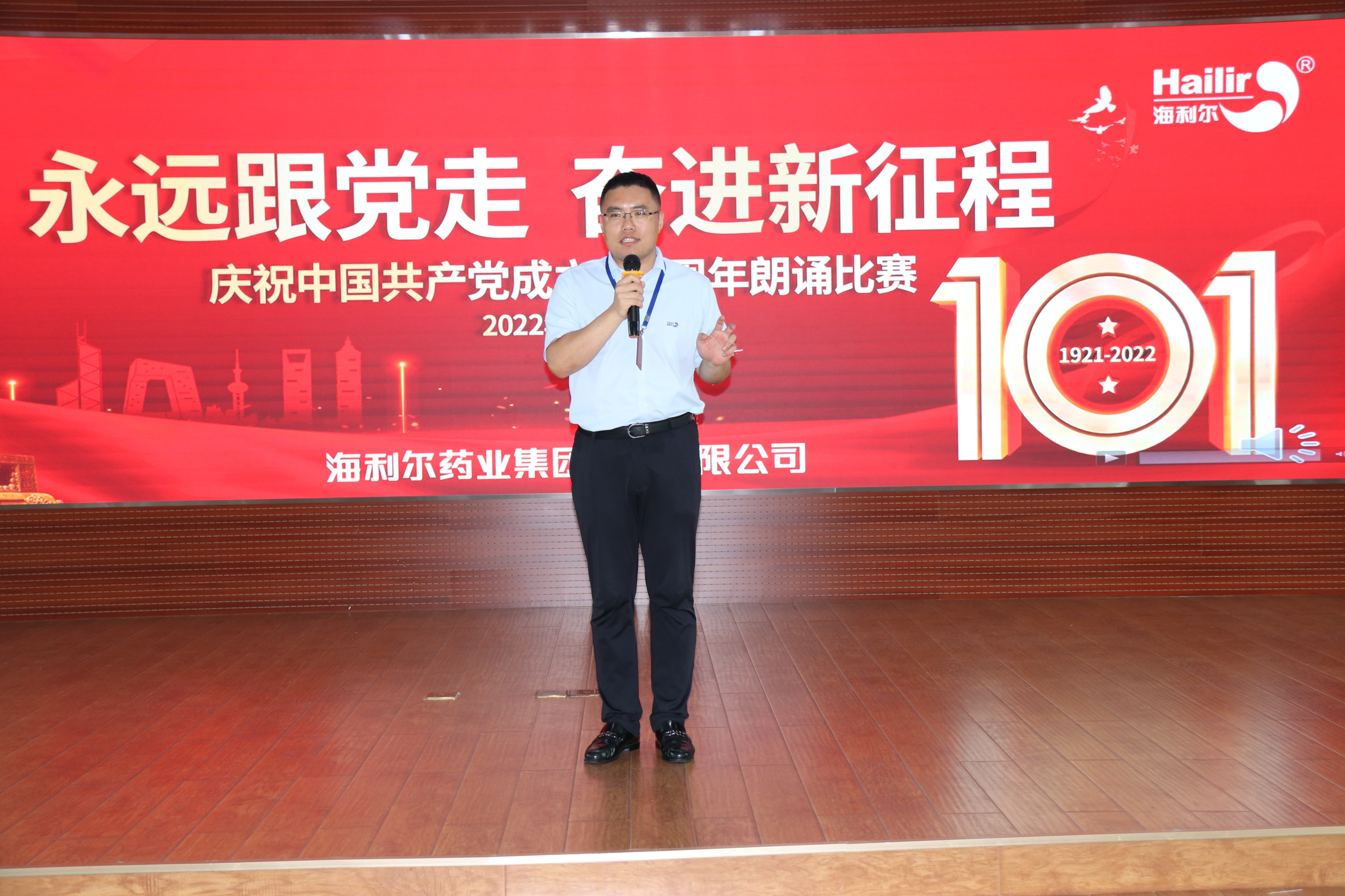 ? ? ? ?集團董事長葛堯倫、集團總裁葛家成、集團總工程師兼研發中心主任王良清、集團制劑生產總監楊勇、集團人力資源總監姜延紅、集團行政管理總監譚長雁等領導出席活動并擔任評委。8個參賽單位(按出場順序)——山東海利爾工廠、國際業務中心、奧迪斯工廠、恒寧生物、青島海利爾工廠、滕潤翔、凱源祥工廠、研發中心一一登場,貢獻了一場場別開生面的朗誦表演。臺上朗讀者聲情并茂,初心激蕩;臺下觀眾席掌聲陣陣,同心飛揚。一場充滿激情與創意、對黨、對祖國、對海利爾愛的表白深情演繹。