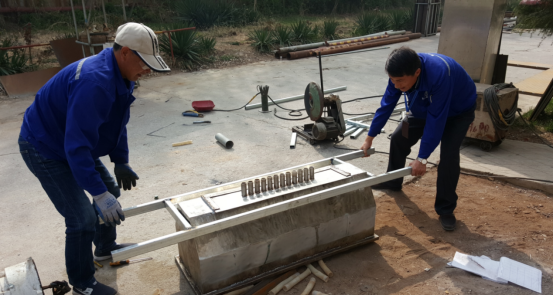 ? ? ??蘇廠長與設(shè)備科人員進行半自動灌裝機的焊接