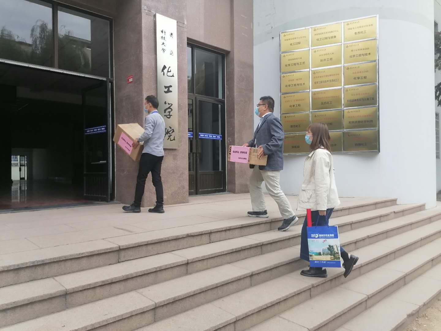 ????????下午3時(shí),志愿者走進(jìn)化工學(xué)院,受到學(xué)院王廣建教授、周欣然主席的熱情接待。接收到抗疫物資后,學(xué)院李院長對(duì)海利爾的慈行善舉大為贊賞,雙方在“校企同心 攜手抗疫”橫幅前合影留念。李院長表示,海利爾是青科大的好朋友、好伙伴,多年來一直保持合作,希望這種友誼長久保持下去,并責(zé)成學(xué)院耿老師、柳老師為海利爾各項(xiàng)活動(dòng)選好人、服好務(wù)。