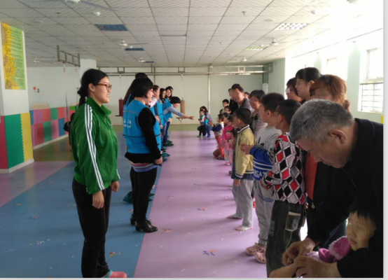走到二樓活動室,正好趕上他們互動游戲課程,這些孩子對陌生人都有一定的抵觸感,所以在老師的引導下,志愿者們通過簡單的互動、自我介紹、擁抱等方式建立了初步友誼,小朋友們慢慢的笑起來。