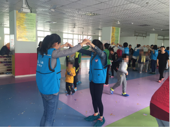 接下來就是“快樂的小火車”游戲,志愿者們主動搭起了“火車軌道”。